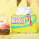 Cheerleader in rosa Outfit mit Pom Poms. Alles Gute zum Geburtstag auf hellgelbem Geschenkpapier.