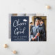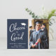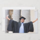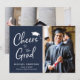 Moderne, dunkelblaue 2-Foto-Abschluss-Anzeigenkarte. Die Vorderseite zeigt das Foto des Absolventen, "Cheers to the Grad" in einer modernen weißen Schrift, und eine weiße Abbildung des Grades-Kappe. Einfach mit dem Namen und der Schule des Absolventen personalisieren und ein weiteres Foto auf der Rückseite hinzufügen.