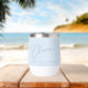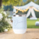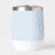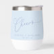 This thermal wine tumbler features a flowing script "Cheers" with the couple's names and wedding date in clean spaced lettering on a soft blue background — a simple, elegant favor that doubles as a keepsake. Perfect for wedding favors, bridal party gifts, engagement parties, or rehearsal dinners. Fully customizable with your names and date.