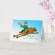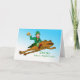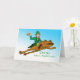 Prost! St. Paddy's Day. St. Patrick's Day Grußkarte mit einem Kobobold, der ein Bier hält und auf einem Frosch reitet. Der Frosch fliegt durch den hellblauen Himmel. Der Kobold ist in einem grünen Anzug gekleidet, Strümpfe gestreift und trägt einen grünen Hut. Art, Bild und Vers Copyright © Shoaff Ballanger Studios, 2024.