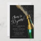 Perfekte Einladung zum 30. Geburtstag für einen Mann oder eine Frau. Eine offene Champagnerflasche mit ausbrechenden Blasen schafft ein festliches Design. Die Feier bis 30 Jahre ist in einem modernen und trendigen Drehbuch geschrieben. Die Geburtstagsdetails folgen weiter unten. Der weiße Text Pop vor dem schwarzen Hintergrund. Der gesamte Text kann bearbeitet werden, damit Sie wirklich ein personalisiertes Erlebnis für Ihre Gäste schaffen können.