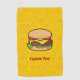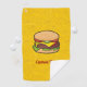 Cheeseburger Ikone. Junk Food Kontur Icons Gelbe Muster Hintergrund. Eigener Text.