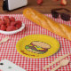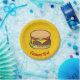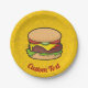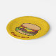 Darstellung des Cartoon von Cheeseburger. Junk Food Kontur Icons Gelbe Muster Hintergrund. Eigener Text.