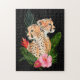 Cheetah Bouquet II von Annie Warren. Zwei Geparden sind von tropischen Blätter und Pflanzen gerahmt, die auf schwarzem Hintergrund gehalten sind. | 164453Z
