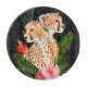 Cheetah Bouquet II von Annie Warren. Zwei Geparden sind von tropischen Blätter und Pflanzen gerahmt, die auf schwarzem Hintergrund gehalten sind. | 164453Z