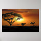 Die Silhouette einer Geparden, die eine Gazelle abreißt. Der Sonnenuntergang strahlt hinter ihnen.