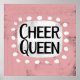 "Cheer Queen" ist ein niedliches Textdesign in Rosa mit schwarzem Text, mit weißer Akzent-Form und weißen, texturierten, weißgetönten weißen Punkten, die ihn umgeben.