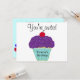 Vanillekuchen zum Geburtstag mit lila Zuckerguss, rot-weiße Sprinklen und eine Yummy Kirsche oben. Personalisieren Sie NAMAE auf hellblauen Wrapper. Geben Sie ein beliebiges Alter ein. Die Rückseite hat farbenfrohe Ballons. Original Artwork Design von TamiraZDesign.