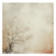 A delicate tree with soft, muted blossoms extends to the left, while a solitary bird flies in the pale, expansive sky. The composition evokes a serene and tranquil atmosphere, with a minimalist approach.