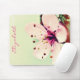 Naher Blick auf die zarte Kirschblüte Blume. Pastellrosa Blume mit weichen, runden Blättern. Hintergrund ist ein blasses Kalkgrün. Personalisieren Sie mit einem Namen in einem pastellrosa Schriftart.