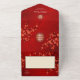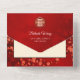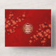 Diese einmalige Hochzeitsfeier bietet ein traditionelles chinesisches Design mit roten Kirschblüten und einem goldenen Doppelglückssymbol auf einem rot schimmernden Hintergrund. Braut- und Gräuelnamen werden in einem eleganten, klassischen Skript geschrieben.