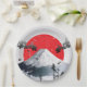 Die Geburt einer neuen Saison in Japan. Eine schöne Abbildung der Blüten und Blüten der Sakurarenkirsche, die in der Brise mit dem Fuji-Berg und der japanischen Fahne im Hintergrund der aufgehenden Sonne kaskadieren. Das moderne Design ist perfekt für ein Weihnachtsgeschenk, ein Geburtstagsgeschenk, ein Kinderzimmer oder eine Wohngestaltung.