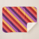 Eine kleine Sherpa-Decke mit einem farbenfrohen Motiv aus diagonalen Streifen in Kirschrot, Melonenrosa, Violett, Pflaume lila und Bananengelb.