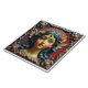 Eine Vintage Keramik mit einem jungen Engelmädchen mit schwerem Haar, Blume und einem goldenen verzierten Halo, Set auf lila und rotem Hintergrund mit goldfarbenem, wirbelfarbenem Rand