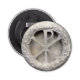 Dieser Knopfflaschenöffner, der als Kühlschrankmagnet auch benutzt werden kann, kennzeichnet den christlichen Symbol Chi-Rho - das Monogramm von Christus, das zusammen mit den Wörtern: "In hoc signo vinces - in diesem Zeichen, erobern Sie" gemachtes Christentum die offizielle Religion des römischen Reiches und des Westens nach dem Sieg von Constantine das große am Milvian Brückenkampf.