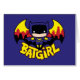 Karo Chibi Batgirl gegen die Gotham City Skyline in einer Fledermaus-Silhouette mit ihrem Logo.