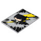 Karo aus Chibi Batman macht einen fliegenden Tritt vor einem blitzförmigen Hintergrund.