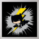 Karo aus Chibi Batman macht einen fliegenden Tritt vor einem blitzförmigen Hintergrund.