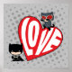 Karo Chibi Catwoman auf Chibi Batman in dieser bezaubernden Grafik, mit einem riesigen roten Herz mit dem Wort "Liebe".