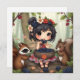 Eine süße Märchen leere Note. Eine niedliche kleine Cartoon-Chibi-Fee, die BlackBerry mit ihren Waldfreunden, einem Waschbär und einem Eichhörnchen isst.