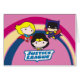 Karo vor Chibi Supergirl, Chibi Wonder Woman und Chibi Batgirl vor einem Regenbogen, der sich von einem blauen Gerechtigkeitsliga-Logo erstreckt.