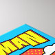 Karo aus Chibi Superman, der in den Wolken fliegt, mit seinem Super-Heldennamen über ihm und der roten Polka Dot Schildform hinter ihm.