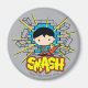 Karo aus Chibi Superman, der sich durch eine Ziegelmauer mit einem großen "SMASH" schleicht!