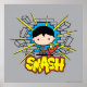 Karo aus Chibi Superman, der sich durch eine Ziegelmauer mit einem großen "SMASH" schleicht!
