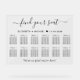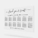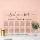 Chic Hochzeitssitzkarte klare Acrylzeichen für bis zu 12 Tische mit "finden Sie Ihren Sitz" in einem stilvollen Skript mit Swashes, Ihre Namen und Hochzeitsdatum verbunden mit einem Herz und "Wir sind so froh, dass Sie hier sind" in einfachen modernen Schriften.