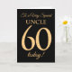 Eine schicke 60. Geburtstagskarte für einen "ganz besonderen Onkel", mit einer Zahl 60, die aus den Zahlen des Goldenen Effekts und dem Wort "Onkel" auf schwarzem Hintergrund besteht. Die innere Botschaft, die Sie ändern können, wenn Sie wollen, ist "Happy Birthday"