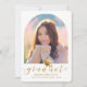 Senden Sie Ihrer Familie und Ihren Freunden eine einzigartige personalisierte Foto Abschluss-Ankündigung mit Ihrem Foto mit einer modernen ovalen Grenze in Weiß. Unten in den Imitaten goldene Skripte ist das Wort "Graduate" mit Ihrem Namen, Schule und Jahr zu personalisieren Akzente durch eine goldene Graduationskappe. Auf der Rückseite der Karte befindet sich ein 2. Foto mit Einzelheiten zum Abschluss. Entworfen von Susan Coffey.