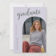 The graduation invitation has a modern and elegant design. The front features a large script title, an arch-shaped frame showcasing the graduate’s portrait, and vertical text displaying their name and school in a clean serif font and Pale lavender Background. The back maintains a minimalist style with a bold script heading, structured event details, and a small graduation cap graphic. The design is clean, sophisticated, and easy to read.