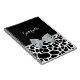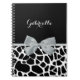 Ein elegantes schwarz-weißes Giraffenprint-Notizbuch mit einem eleganten silbergrauen Band, das in einen femininen Bogen gebunden ist. Personalisieren Sie dieses mädchenhafte Design durch Hinzufügen Ihres Namens. Flachdruckbild, nicht eigentlicher Bogen.