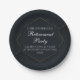 Diese schicke Papierplatte aus schwarzem und goldenem Party mit einem modernen geometrischen Hexagon um Ihre personalisierte Botschaft in weißer Typografie. Elegante Dekoration für einen Rentner, der am Ende seiner Karriere von Freunden und Familie gefeiert wird.