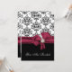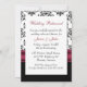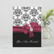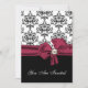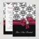 Elegante Hochzeitsdinner in der Probe, in Schwarz, Weiß und Bordeaux. Die Grafik eines schönen schwarz-weißen Damast-Musters oben, das schwarze Schwarz unten, die Einladung, mit einem hübschen bordeauxfarbenen Bogen, in der Mitte, mit einer perlfarbenen Baubeldekoration. Sie sind eingeladen, in weißem Skript-Text, auf der Vorderseite der Einladung, und Schwarz-und Bordeaux-Text, auf der Rückseite ist vollständig anpassbar, um Ihren Anzug Ihre Veranstaltung benötigt. Liebliche Einladung wird das Paar Schatz, mit all ihren Hochzeitsmamentos.