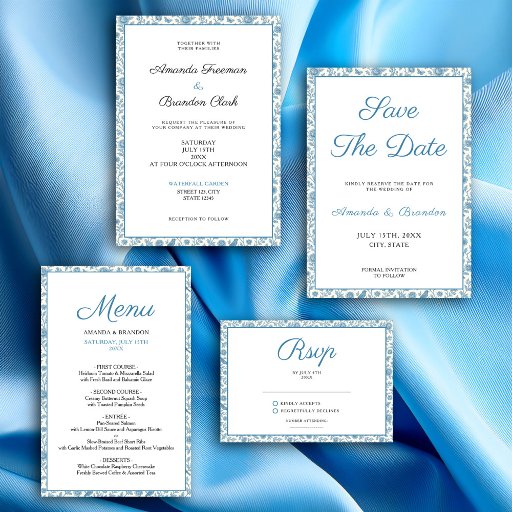 A refined design framed with a classic blue Toile de Jouy floral pattern. The delicate vintage-inspired border adds timeless charm, ideal for traditional or countryside-themed celebrations. Easily customizable with your event details.