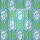 Ein sehr hübsches Gewand mit Motiven der blauen Blume von Periwinkle auf Weiß, in einem dekorativen Sechseck, alles auf grünem Hintergrund. Als Teil der Posh und Painterly 'Periwinkle Patch' Kollektion kann dieses Muster leicht an jedes beliebige Stoff angepasst werden.