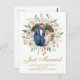 Ein eleganter Zirkel von Aquarellblütenpinkern und Elfenbeincreme-Rose umrahmt diese hübsche Postkartenverkündung des Fotos Just Married. Die botanischen Blätter der Salbei-grünen Eukalyptus schmücken inmitten der pfirsichfarbenen Reihe von Blume über dem wunderschönen kursiven Drehbuch. Diese zarten Postkarten sind perfekt für Neuvermählte, die während dieser gesellschaftlichen Distanzierungsperiode eine intime, kleine Zeremonie mit naher Familie hatten. Eine schöne Art für eine Braut und ein Bräutigam, allen zu sagen, dass sie sich entwickelt haben.