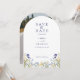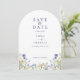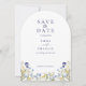 Chic boho einfache Wildblumen Hochzeit Save the Date mit blauer Kalligrafie mit Foto auf der Rückseite