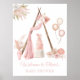 Ein elegantes, schicker Boho, Girl Baby Shower Welcome Poster. Auf weißem Hintergrund ist die Einrichtung mit einem Zelt aus Holz, einem eleganten rosa Vorhang, rosa getrockneten Blume, Ballons und Kuchen geschmückt. Personalisieren Sie diese, indem Sie Ihren Namen hinzufügen.