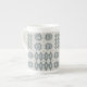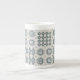 Eine schicke China-Kaffee-Tasse, mit einem Muster traditioneller walisischer Tapisserie-Motive in Dunkelgrau auf Sandboden. Dieses Muster passt in alle Tasse.