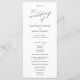 Einfaches Hochzeitsprogramm mit der "Hochzeit von" in Kalligrafie zusammen mit Ihren Hochzeitsdetails und der Reihenfolge der Zeremonie in Schwarz und Weiß. Die Rückseite hat Ihre Hochzeitsfeier und danke Ihnen Nachricht. Ein minimalistisches Design mit schicker Typografie für eine elegante Touch.