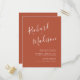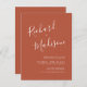 Mit dieser eleganten, minimalistischen und eleganten Hochzeitseinladung lädt sie ihre Gäste zu einer virtuellen Hochzeitsfeier ein, die eine kalligraphische Schrift des Bräutigams und des Brautennamens sowie einen serifenlosen Schriftart der Hochzeitsdetails im Terrakotta-Hintergrund enthält. Sie können das Foto auf der Rückseite personalisieren.