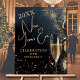 Stylish New Year's Eve party ACRYLIC welcome sign features a champagne glass, clocks, confetti and fireworks on a midnight blue background with your party details in chic lettering. MATCHING items in our collection.