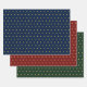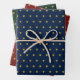 Set des Packpapiers in einem klassischen, goldgelben Sternenmuster auf grünem, marineblau und rotem Hintergrund.