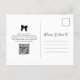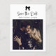 Diese elegante und schicke, schwarz-weiße Hochzeit speichern das Datum Postcard verfügt über moderne, skurrile Skripte. Ein trendiger, schwarzer Coquette-Bogen und Ihr Lieblings-Paare-Foto sind auf der Vorderseite zu sehen. Die Rückseite hat Platz für Ihre Hochzeitsdetails, und es gibt auch einen QR-Code, den Gäste scannen können, um Ihre Hochzeitswebsite zu besuchen. Alle Farben können geändert werden, inklusive Bogen und Skript.