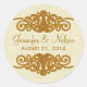 Eleganter Hochzeitsaufkleber aus Umschlag Aufkleber in hübscher Creme und khaki wirl-Muster. Grafik von goldenen Tondekorationen über und unter dem goldbraunen Text. Personalisieren Sie den Text mit den Namen der Braut und des Bräutigams und dem Hochzeitstag. Die Touch zum Hochzeitsempfang und Dankeschön-Karten.