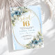 Perfect for elegant, modern, or garden-inspired parties, the harmonious mix of dusty blue, white florals, and greenery creates a timeless look that feels both youthful and upscale. The gold frame adds a subtle touch of glamour, making this design ideal for formal Sweet Sixteen events, evening celebrations, or classy birthday themes. The balanced layout ensures party details are easy to read while maintaining a polished, photo-worthy presentation.