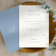 Lieblich staubige blaue und Elfenbeinflache Hochzeitskarte mit zwei Monogramm auf der Rückseite. Dieses Template verfügt über ein zeitgemäßes Set an Schriftart und eine leicht anpassbare Auswahl an Speisen. Der Gegenstand ist Teil einer Hochzeitskollektion, die eine handgefertigte Auswahl von stationären zu passenden Teilen enthält.