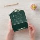 Alles in einem smaragdgrünen verschobenen Hochzeitseinladung mit botanischen grünen rustikalen Blätter, die über einen goldenen Bogen fallen, der elegante Typografie umschließt. Die Einladung enthält eine perforierte RSVP-Karte mit Ihrem Hochzeitswebsite QR Code. Entwickelt von Thisisnotme©